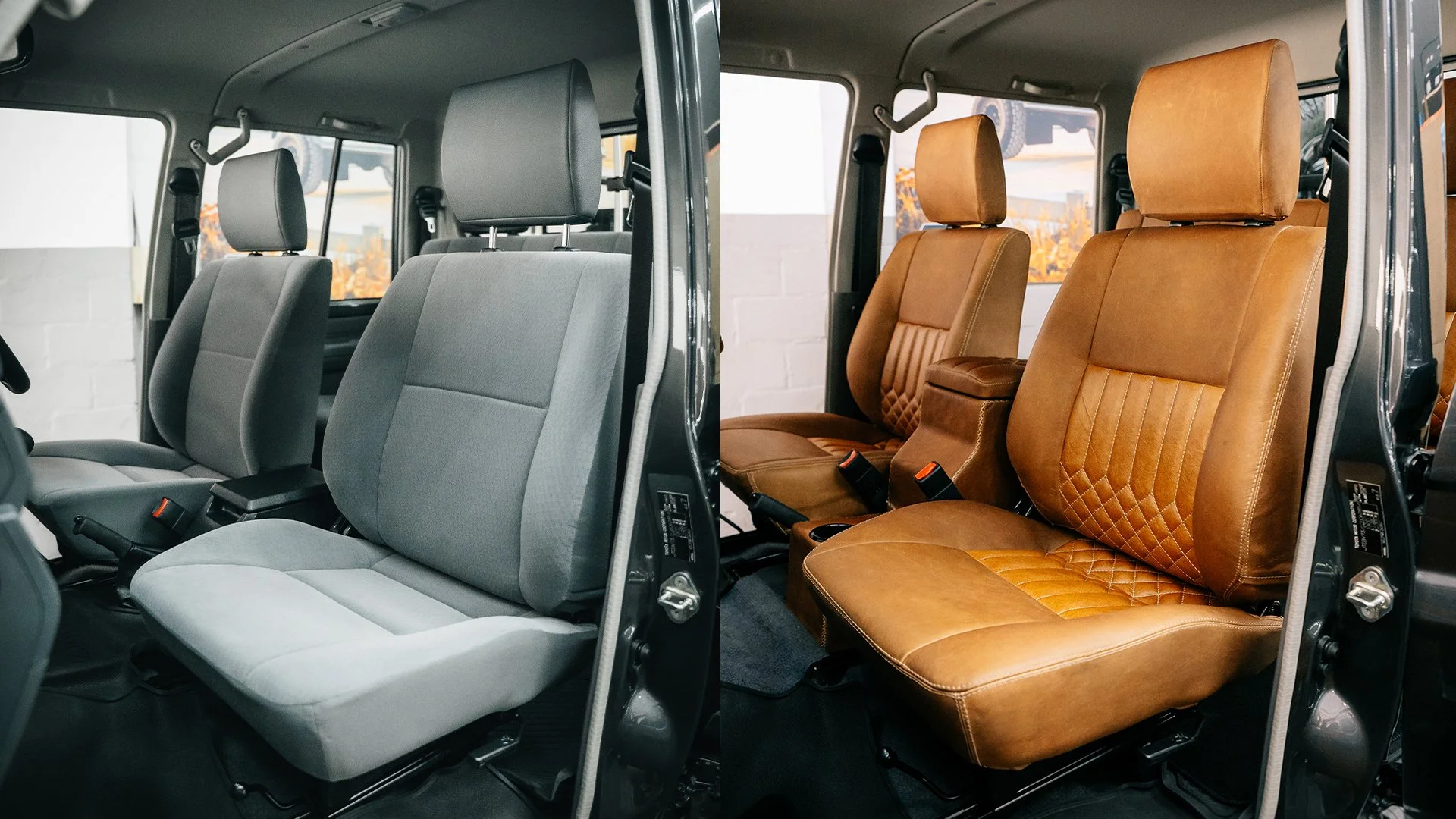 Inside, we upgraded the cabin with leather-recovered seats, door panels, handbrake and gear boots, paired with a custom-built centre console featuring integrated cupholders and a laser-engraved gear knob. Wood detailing throughout the interior adds warmth and character, while full soundproofing refines the driving experience.
